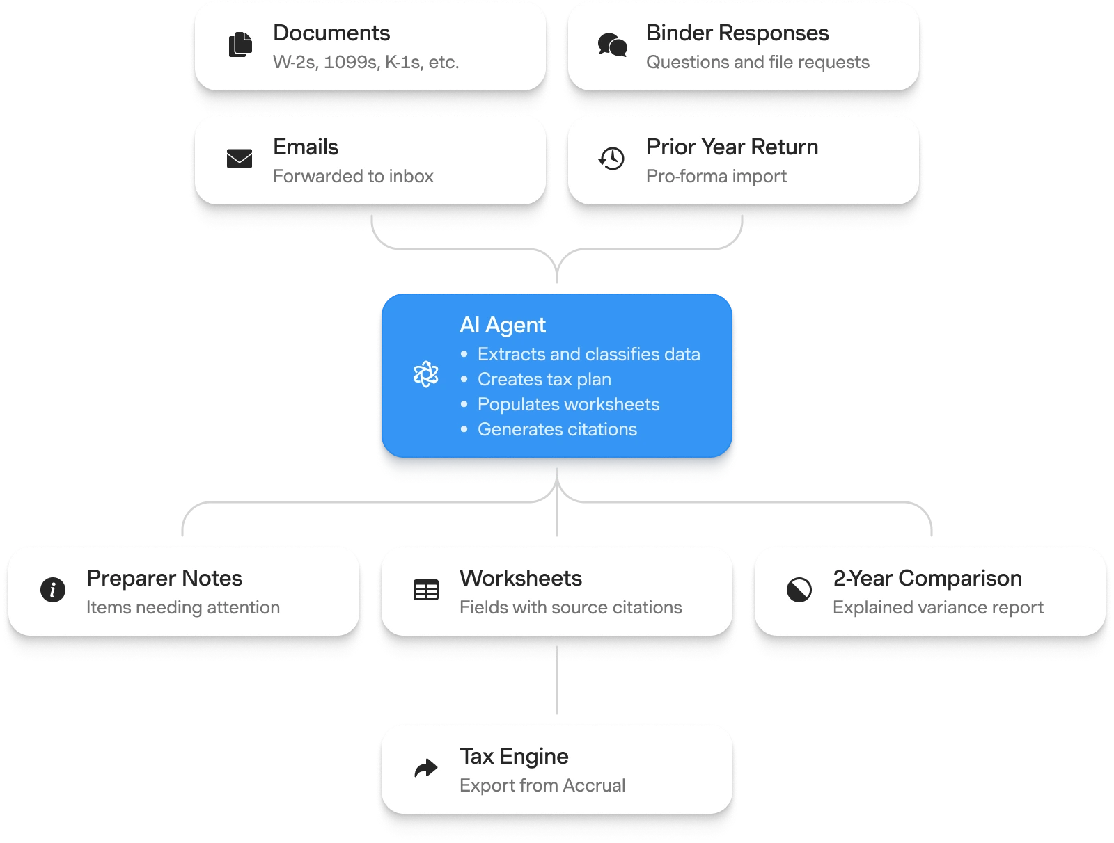 Accrual is built for the reality of accounting inputs, from complex K-1s and 1099s to spreadsheets, emails, photos, and multi-hundred-page statements. Each input is automatically classified, organized, and linked. Deep integrations with existing tax engines enable seamless imports of prior-year returns and carryforwards, as well as clean exports, so firms can continue working within the systems they already trust. As data moves through Accrual, the platform builds a coherent understanding of each client’s financial footprint: what each document represents, what has changed year over year, and where anomalies emerge.